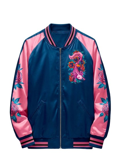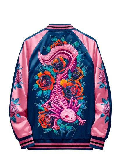The raglan sleeve cut allows natural movement while preserving a structured shape. Built on traditional varsity jacket craftsmanship, this piece integrates modern graphic expression for versatile everyday wear.