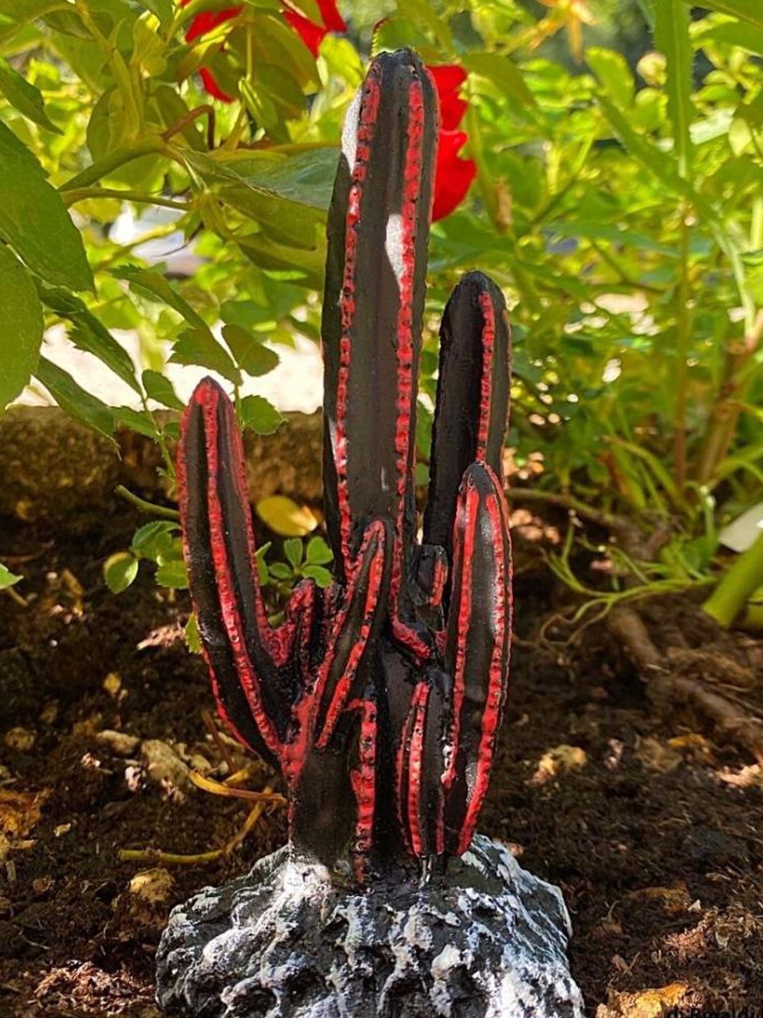 The entire cactus is sculpted with natural rib lines and given a stone-black finish, making it look like a cactus shaped by desert night or cooled lava rock — mysterious and visually powerful.