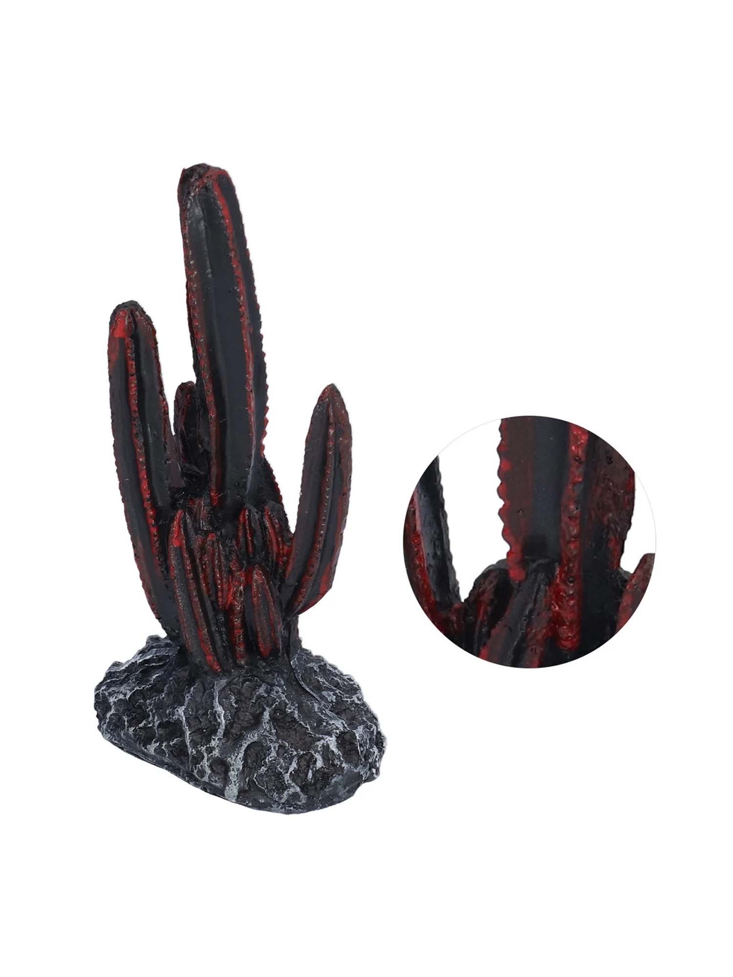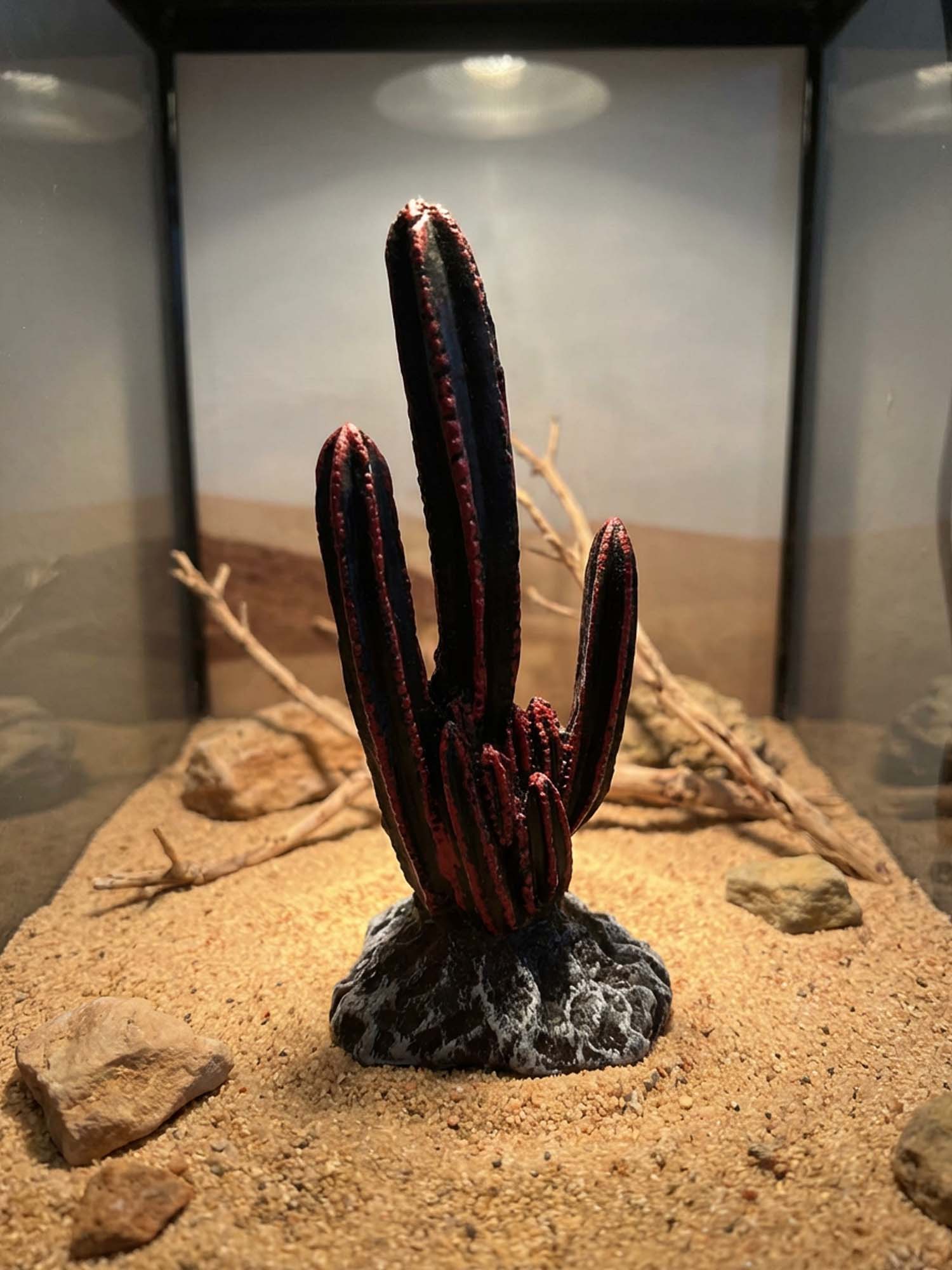 Its striking matte-black cactus body paired with vivid red thorn accents delivers a bold, volcanic-desert aesthetic — perfect for desert, wasteland, Jurassic, or fantasy-themed reptile habitats.