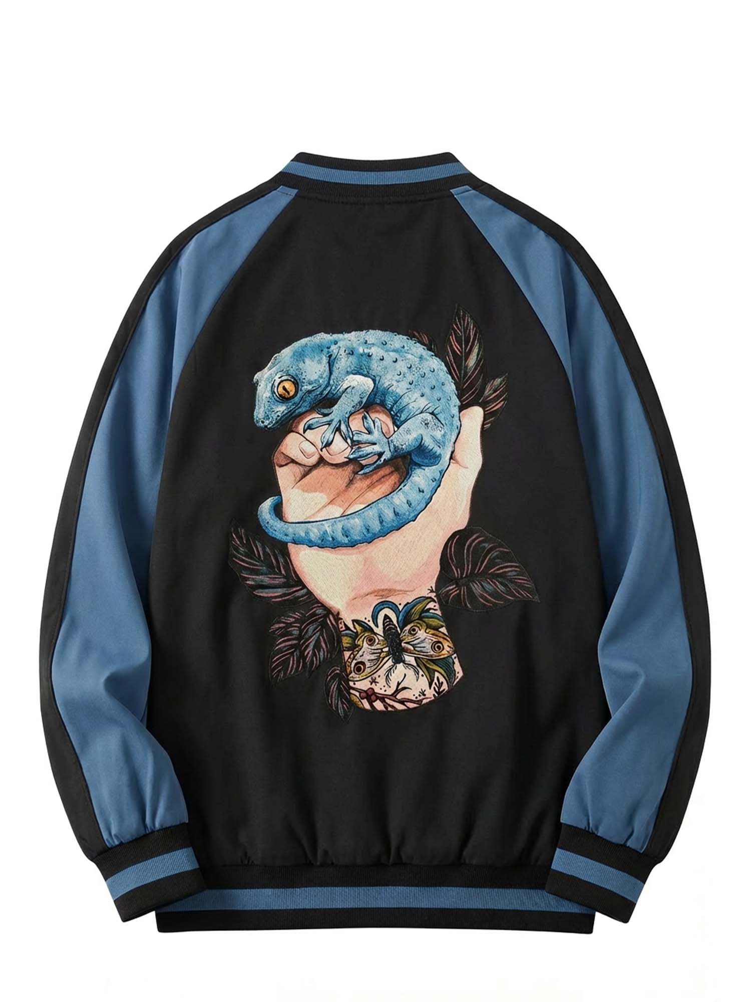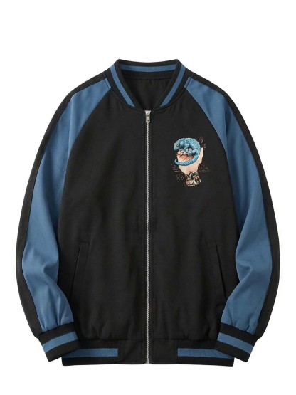 The raglan sleeve cut allows natural movement while preserving a structured shape. Built on traditional varsity jacket craftsmanship, this piece integrates modern graphic expression for versatile everyday wear.