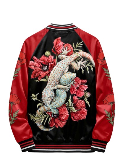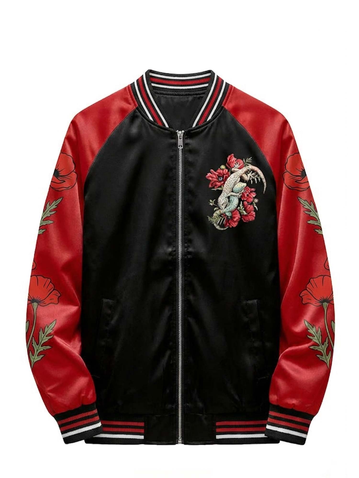The raglan sleeve cut allows natural movement while preserving a structured shape. Built on traditional varsity jacket craftsmanship, this piece integrates modern graphic expression for versatile everyday wear.