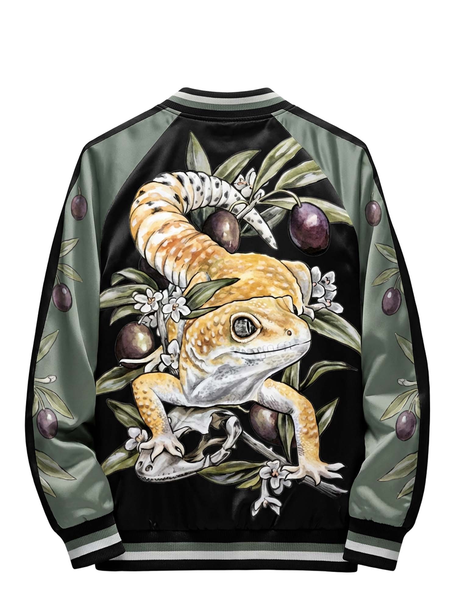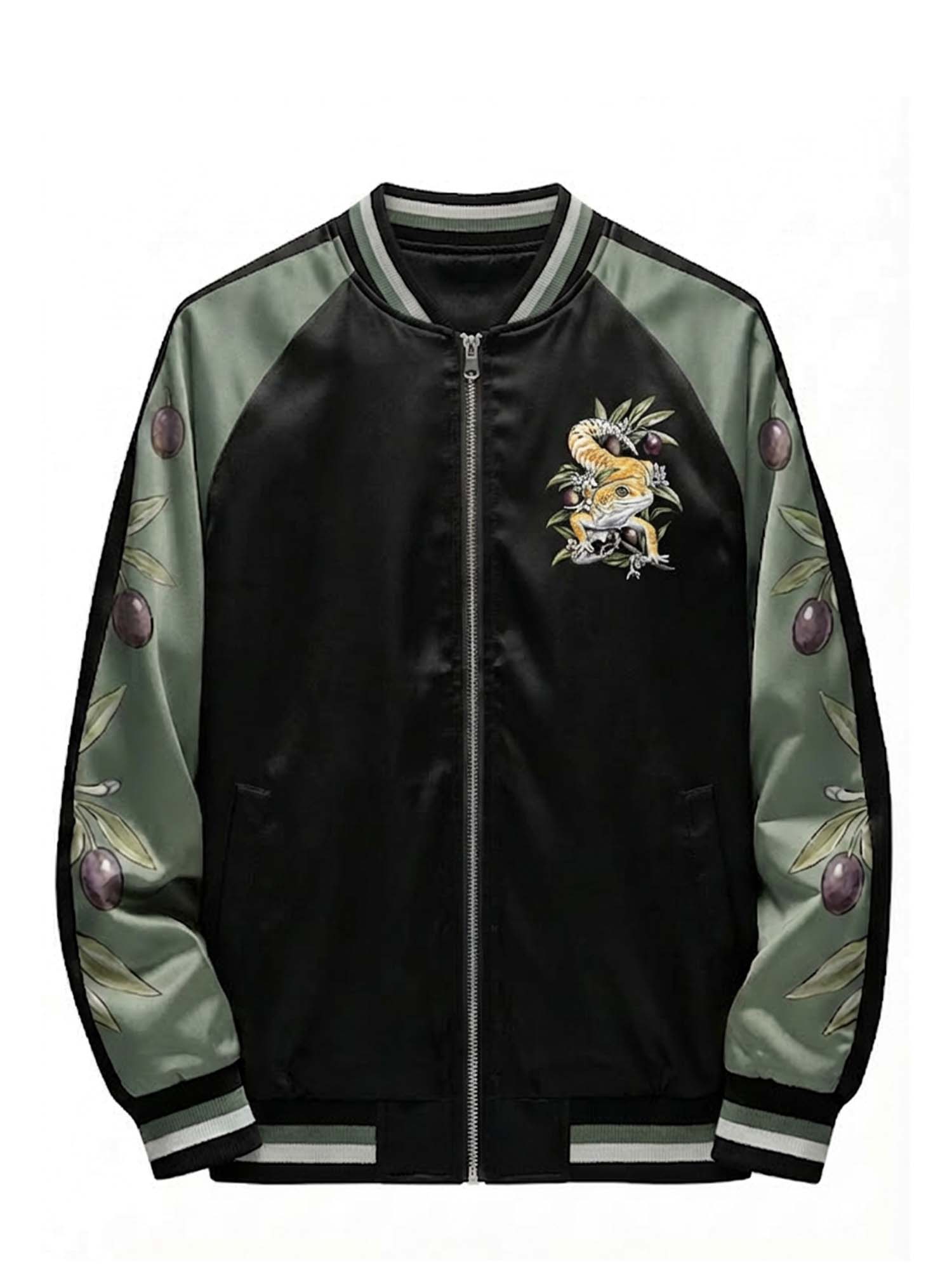 The raglan sleeve cut allows natural movement while preserving a structured shape. Built on traditional varsity jacket craftsmanship, this piece integrates modern graphic expression for versatile everyday wear.