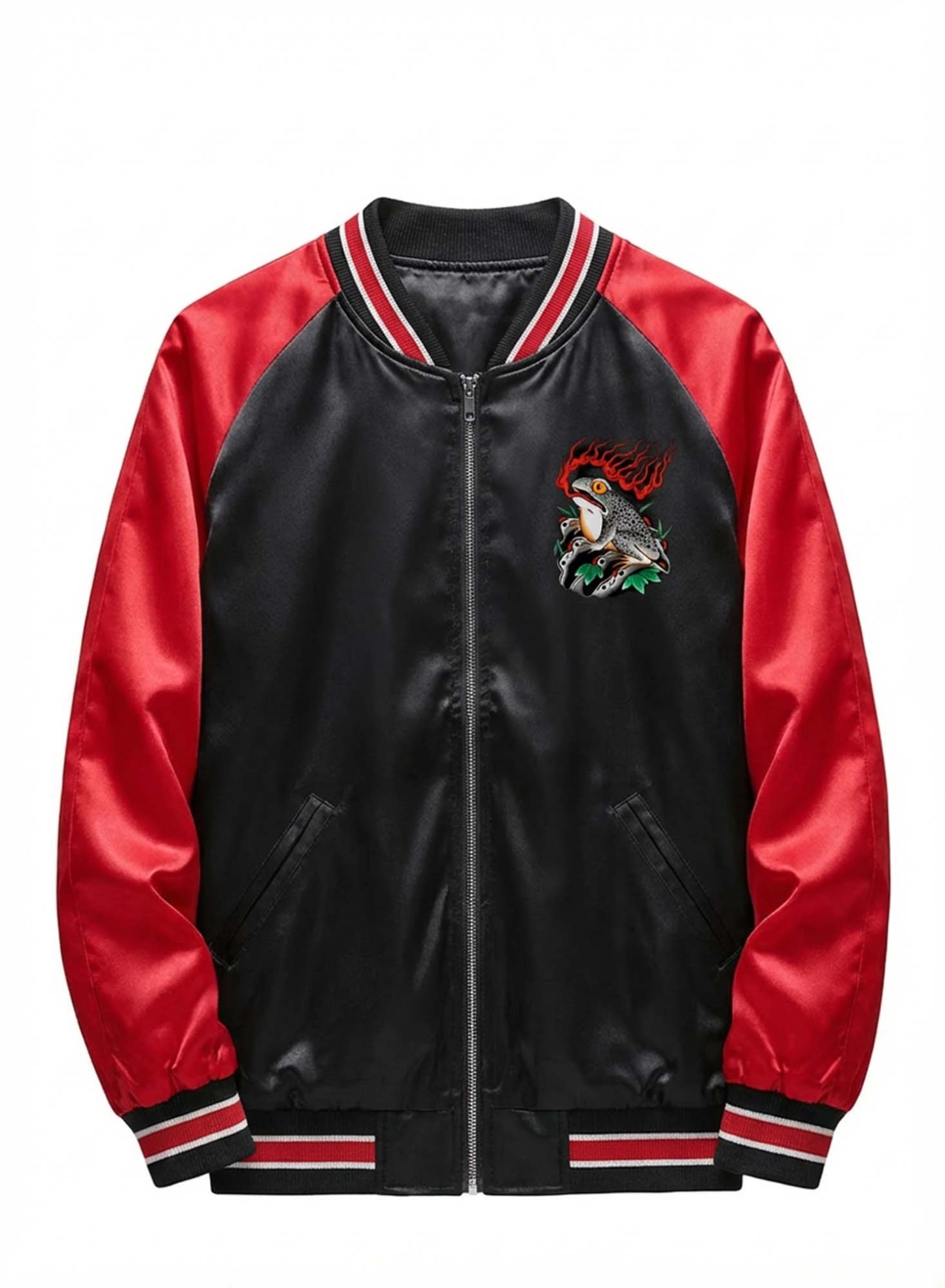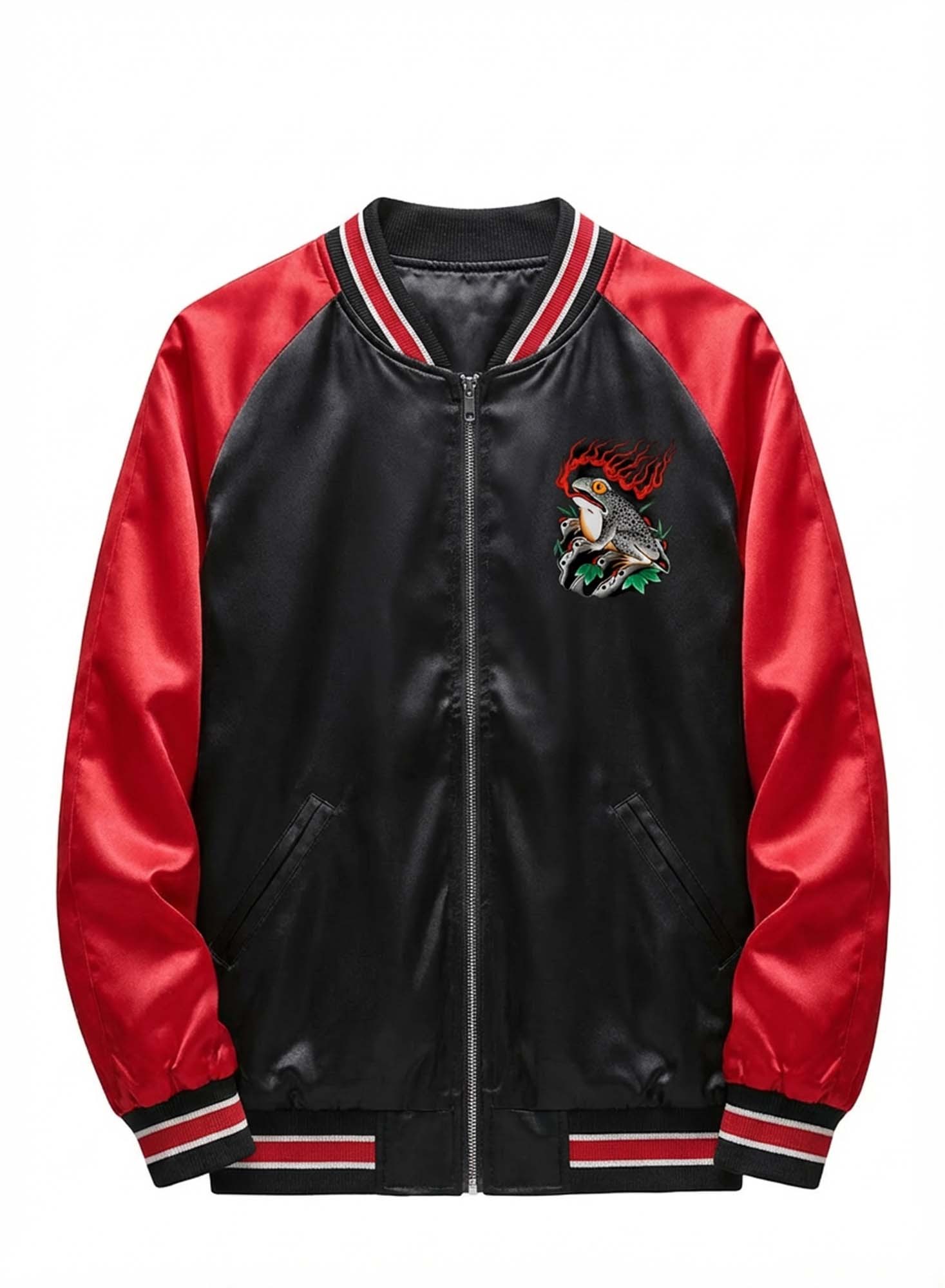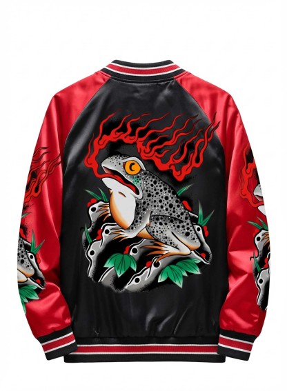 The raglan sleeve cut allows natural movement while preserving a structured shape. Built on traditional varsity jacket craftsmanship, this piece integrates modern graphic expression for versatile everyday wear.