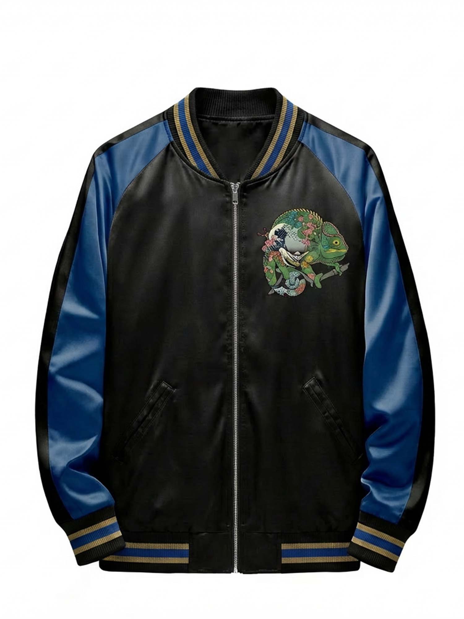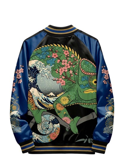 The raglan sleeve cut allows natural movement while preserving a structured shape. Built on traditional varsity jacket craftsmanship, this piece integrates modern graphic expression for versatile everyday wear.