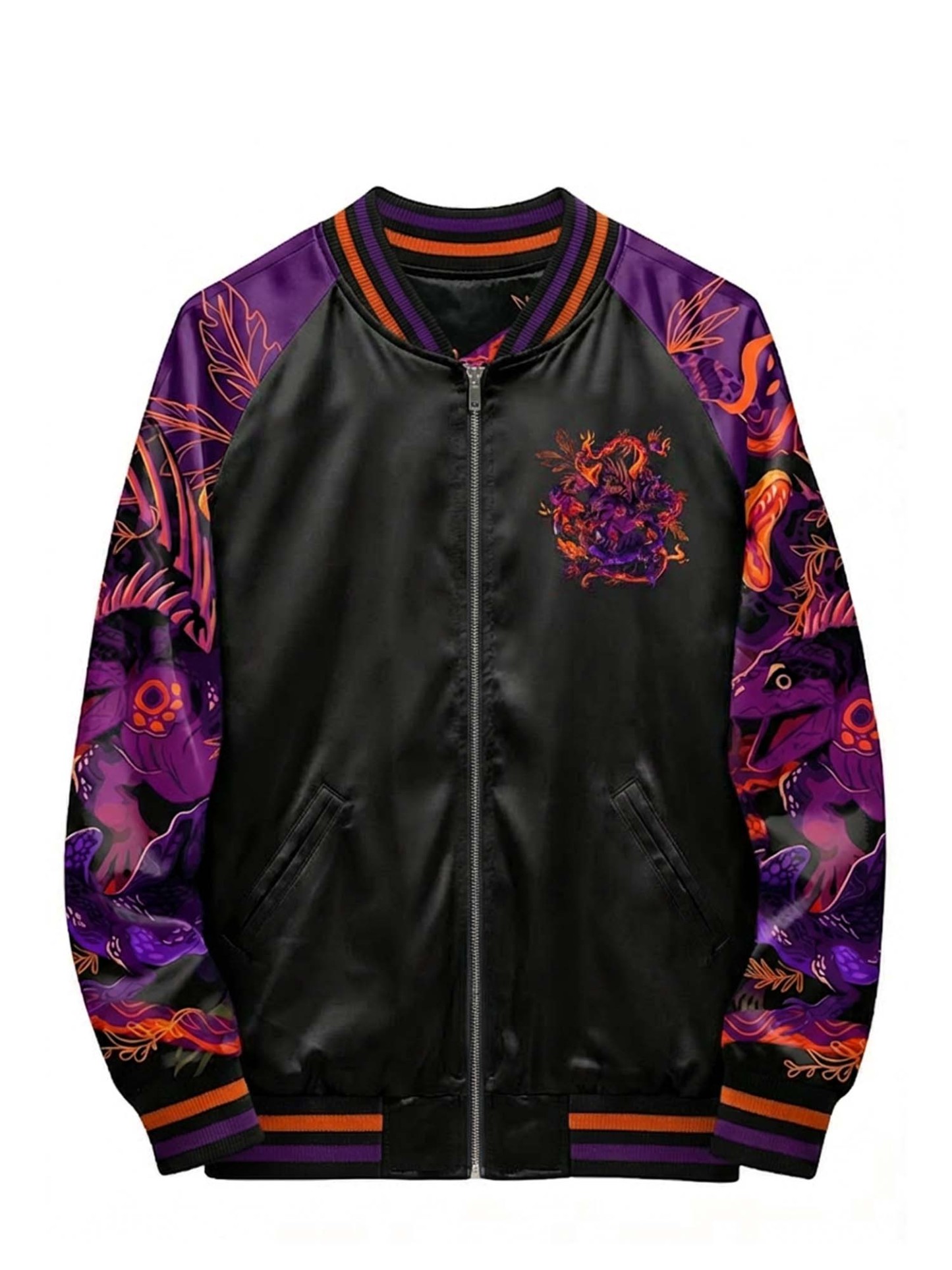 The raglan sleeve cut allows natural movement while preserving a structured shape. Built on traditional varsity jacket craftsmanship, this piece integrates modern graphic expression for versatile everyday wear.